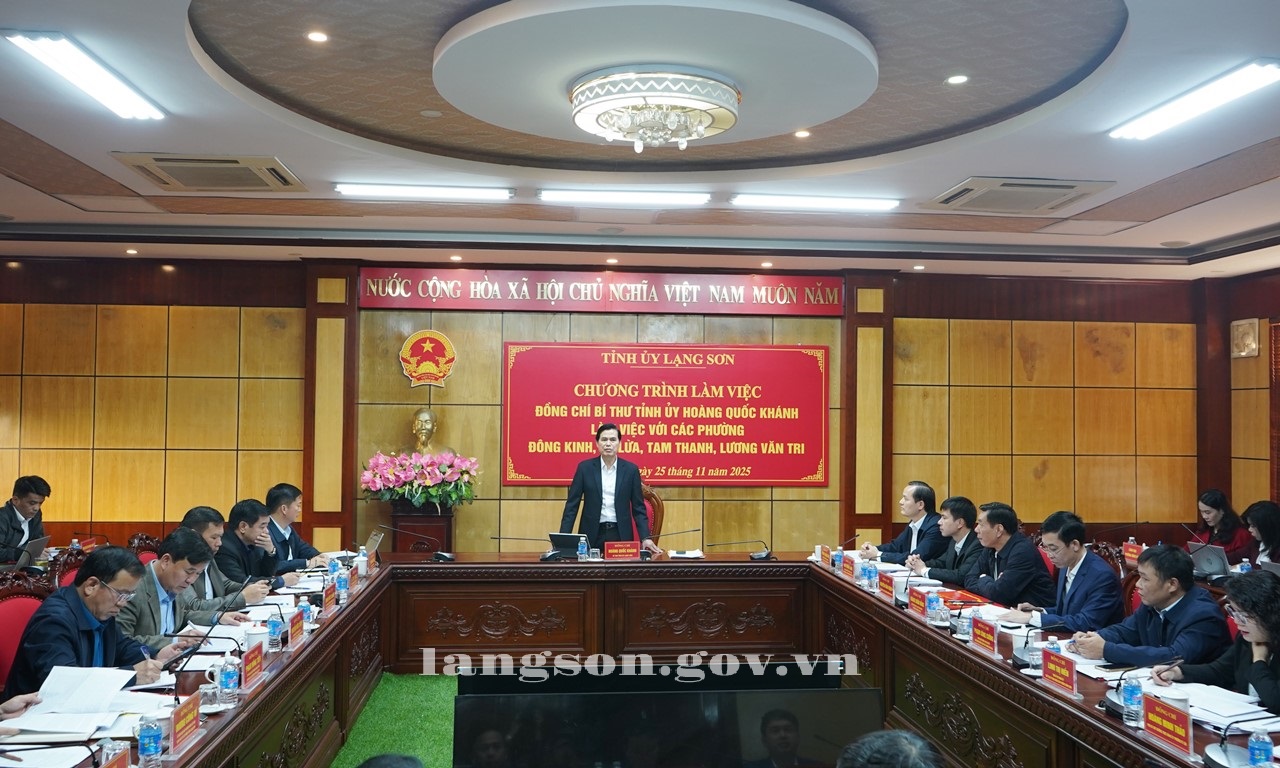 Chiều 25/11/2025, đồng chí Hoàng Quốc Khánh Bí thư Tỉnh ủy, Tổ trưởng Tổ 1 (theo Quyết định số 58-QĐ/TU ngày 20/11/2025 của Ban Thường vụ Tỉnh ủy về việc phân công các đồng chí Ủy viên Ban Thường vụ Tỉnh ủy, Ủy viên Ban Chấp hành Đảng bộ tỉnh; cán bộ lãnh đạo các sở, ban ngành tỉnh phụ trách đảng bộ xã, phường) đã chủ trì Chương trình làm việc với Thường trực Đảng ủy các phường Đông Kinh, Kỳ Lừa, Tam Thanh và Lương Văn Tri để đánh giá công tác lãnh đạo, chỉ đạo, điều hành và kết quả triển khai thực hiện các nhiệm vụ từ ngày 01/7/2025 đến nay.
