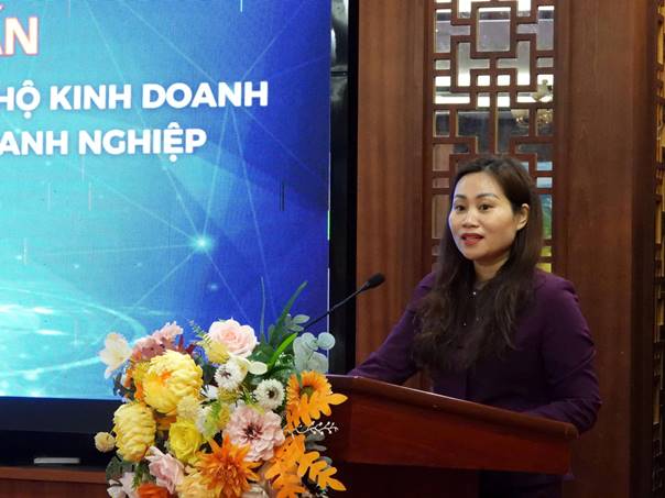 Ảnh: Bà Nguyễn Hồng Vân – Trưởng phòng Quản lý đăng ký kinh doanh- Cục phát triển doanh nghiệp tư nhân và kinh tế tập thể, Bộ Tài chính trình bày tại Hội nghị