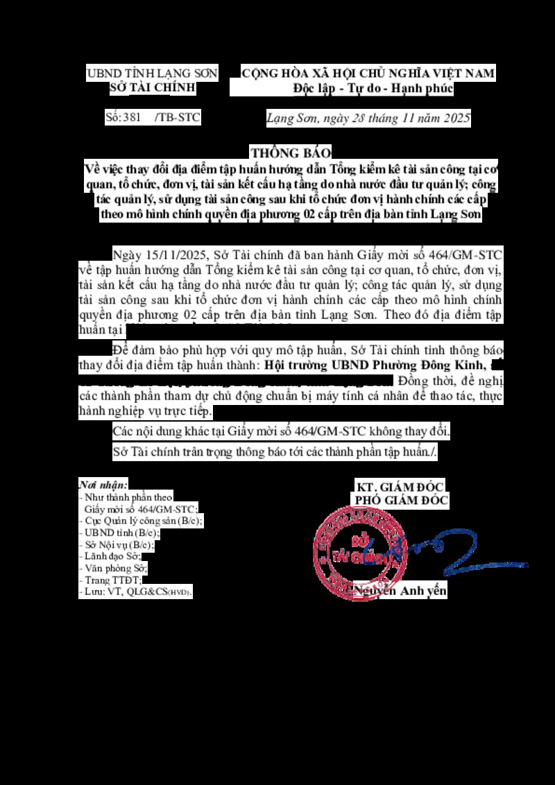 | Tiêu đề văn bản | Thông báo Về việc thay đổi địa điểm tập huấn hướng dẫn Tổng kiểm kê tài sản công tại cơ quan, tổ chức, đơn vị, tài sản kết cấu hạ tầng do nhà nước đầu tư quản lý; công tác quản lý, sử dụng tài sản công sau khi tổ chức đơn vị hành chính các cấp theo mô hình chính quyền địa phương 02 cấp trên địa bàn tỉnh Lạng Sơn | ||