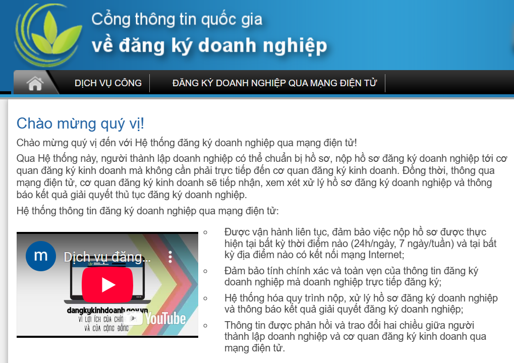Hình ảnh: Giao diện cổng thông tin nộp hồ sơ trực tuyến lĩnh vực đăng ký doanh nghiệp