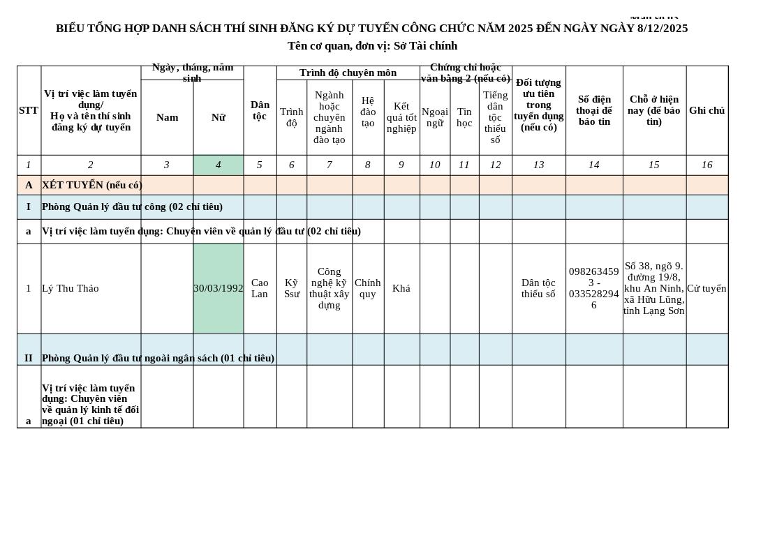 | Tiêu đề văn bản | Thông báo danh sách thí sinh đăng ký dự tuyển Công chức năm 2025 của Sở Tài chính (Đến ngày 13/11/2025) | ||