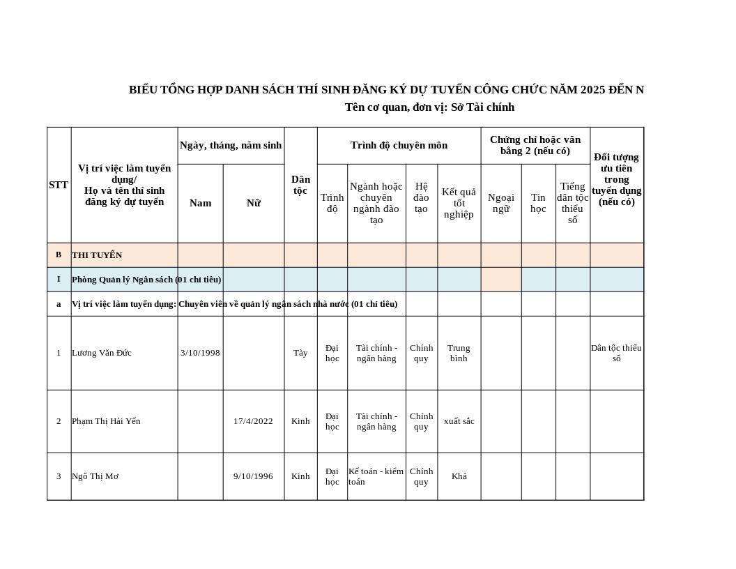 | Tiêu đề văn bản | Thông báo danh sách thí sinh đăng ký dự tuyển Công chức năm 2025 của Sở Tài chính (Đến ngày 19/11/2025) | ||