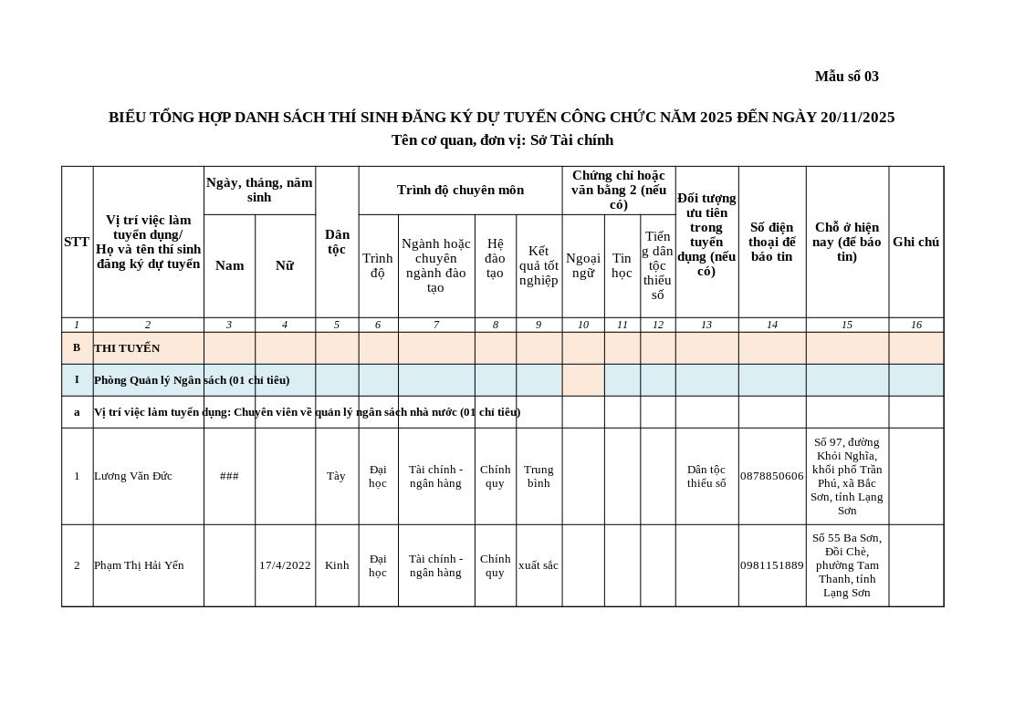 | Tiêu đề văn bản | Thông báo danh sách thí sinh đăng ký dự tuyển Công chức năm 2025 của Sở Tài chính (Đến ngày 20/11/2025) | ||